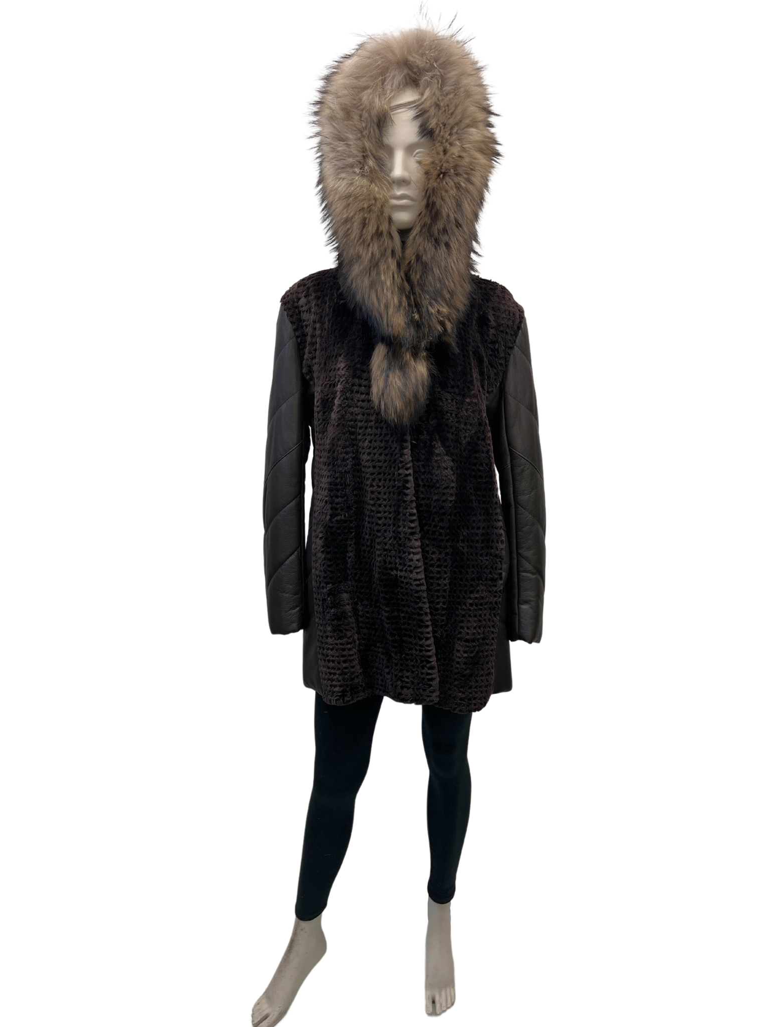 / Brown and leather shaved beaver coat with Finnish cat collar – 8566