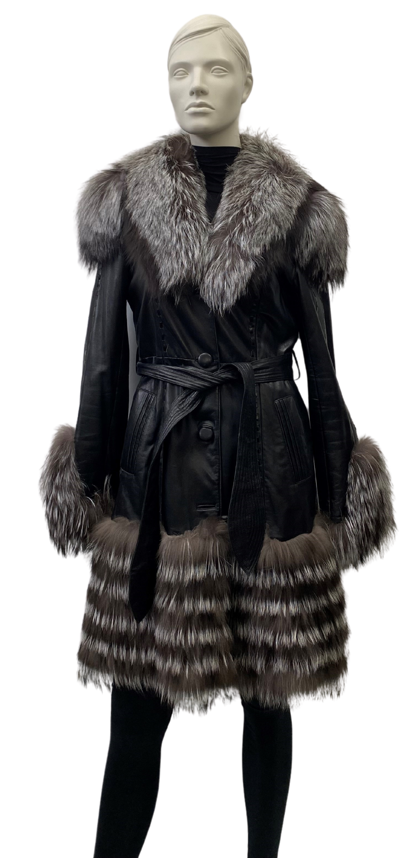 Manteau de cuir et renard argenté et ceinture – 8693