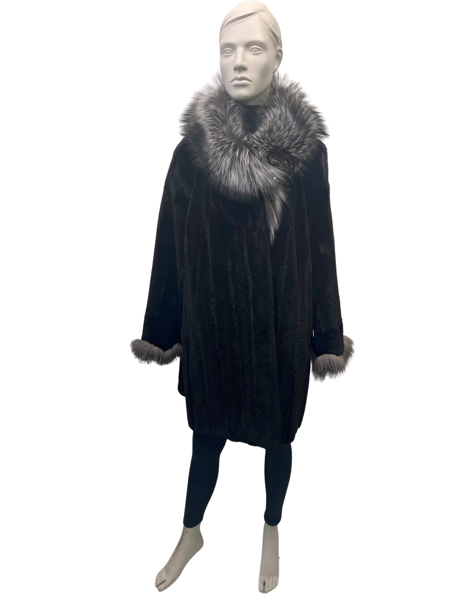 Natural black shaved female mink coat with fox fur - 8543 quantity