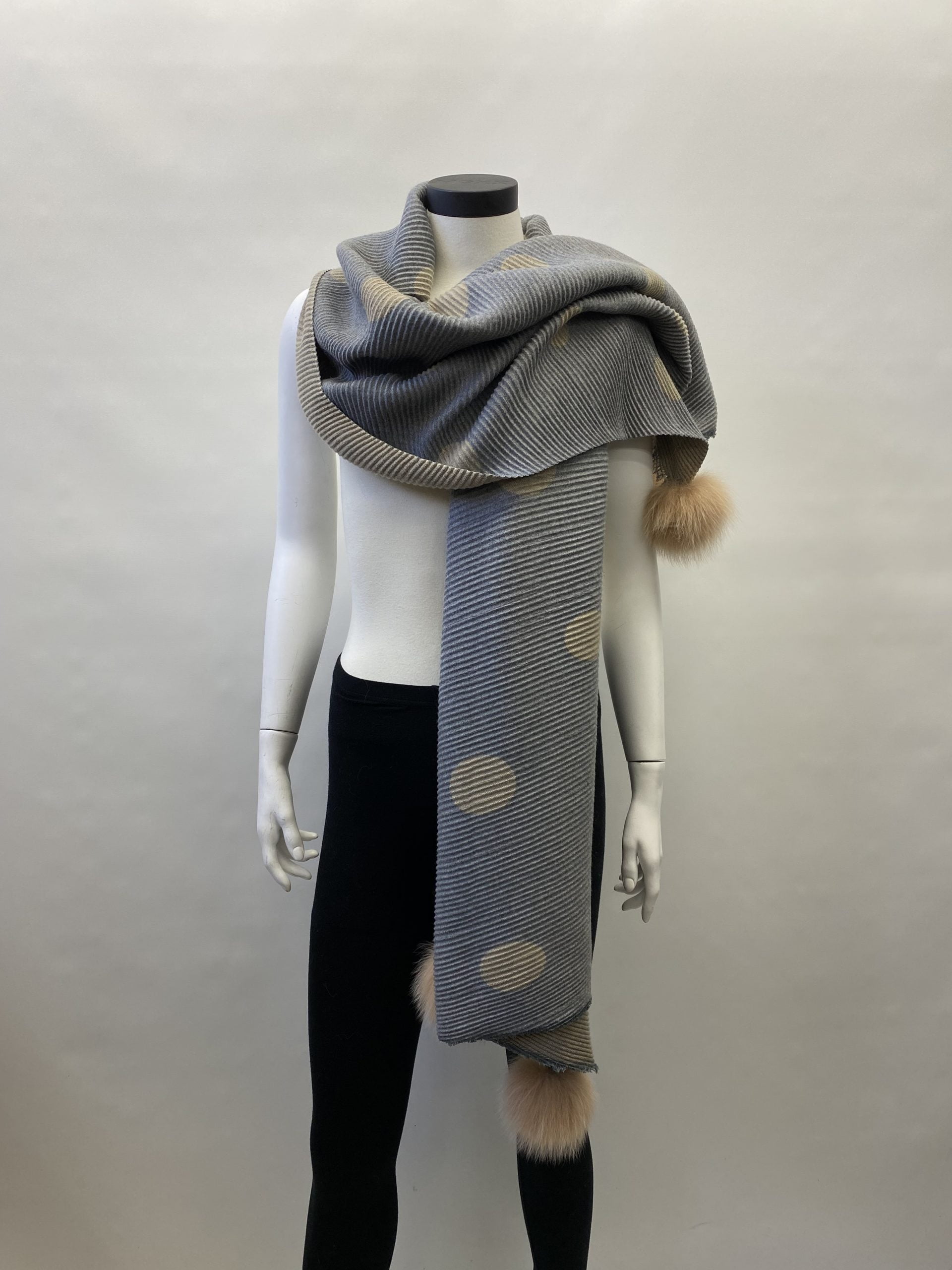 Mitchie’s Matchings produces a wide range of products using only genuine furs: mink, fox, shaved beaver, chinchilla, coyote and rabbit, all dyed in a variety of fashionable colors. Whatever your style, personality, career or mood, Mitchie accessories are designed for you. You can be “matched” from head to toe with our complete range of products. When the temperature drops, be ready to snuggle up in cozy, trendy or classic fur accessories from “Mitchie’s”. – Reversible scarf with large polka dots