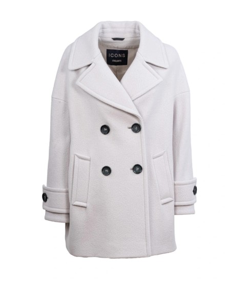 Double-breasted wool pea jacket. Fully lined with a regular, slightly balloon-shaped cut at the back.