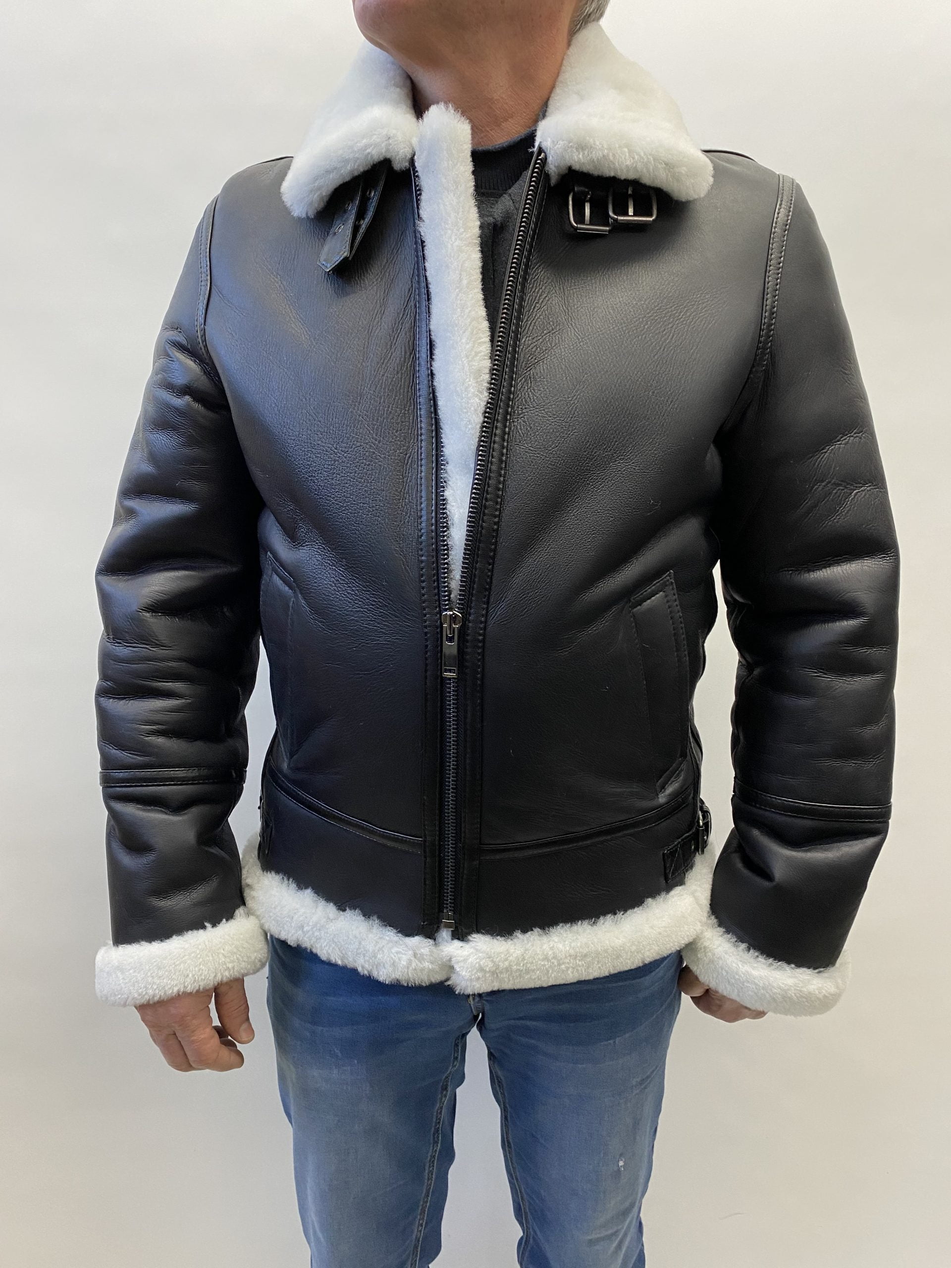 Manteau court style aviateur en mouton retourné. Cet item est disponible en noir et brun