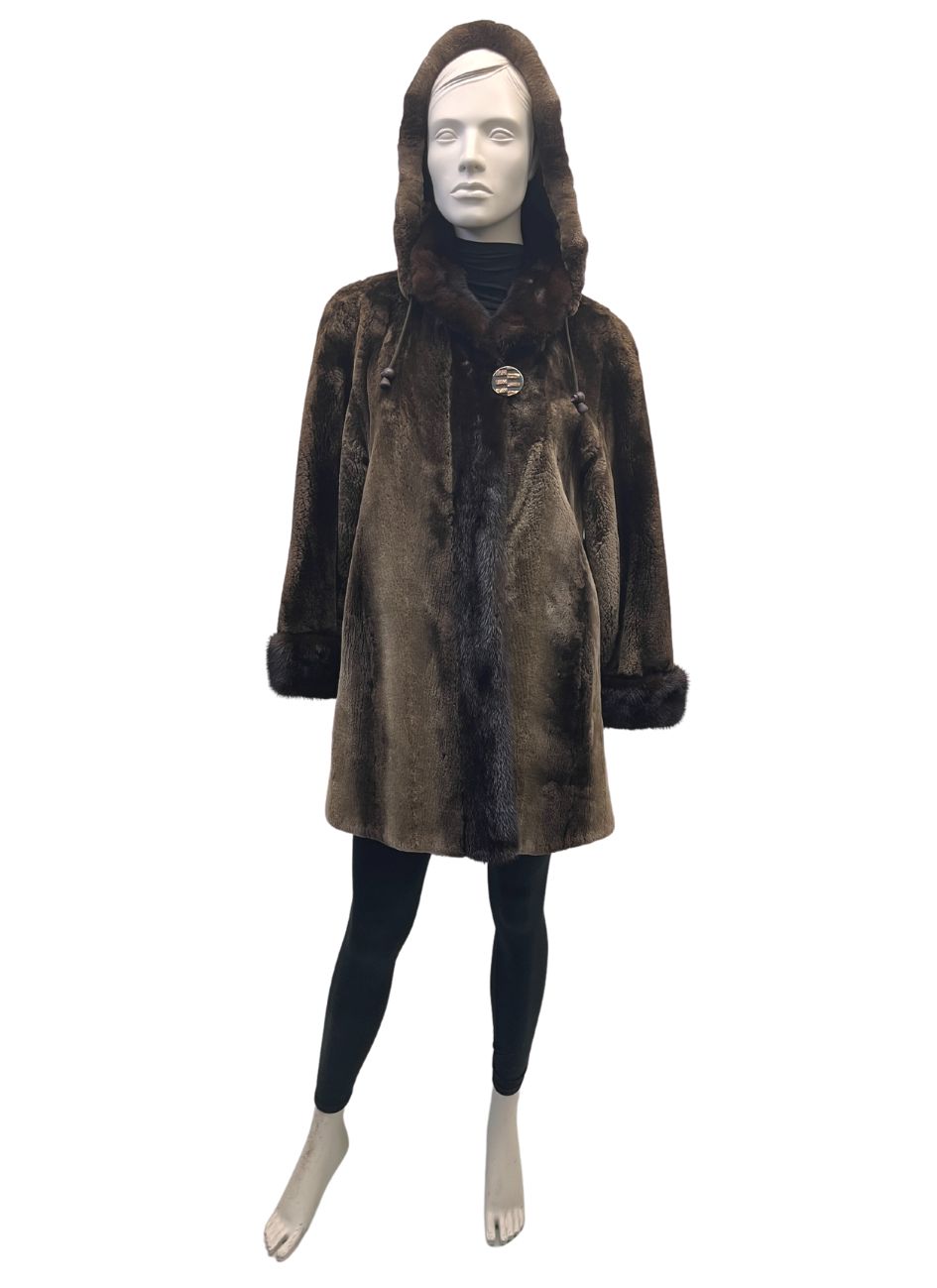 Manteau de castor rasé garni de vison et capuchon – 8447