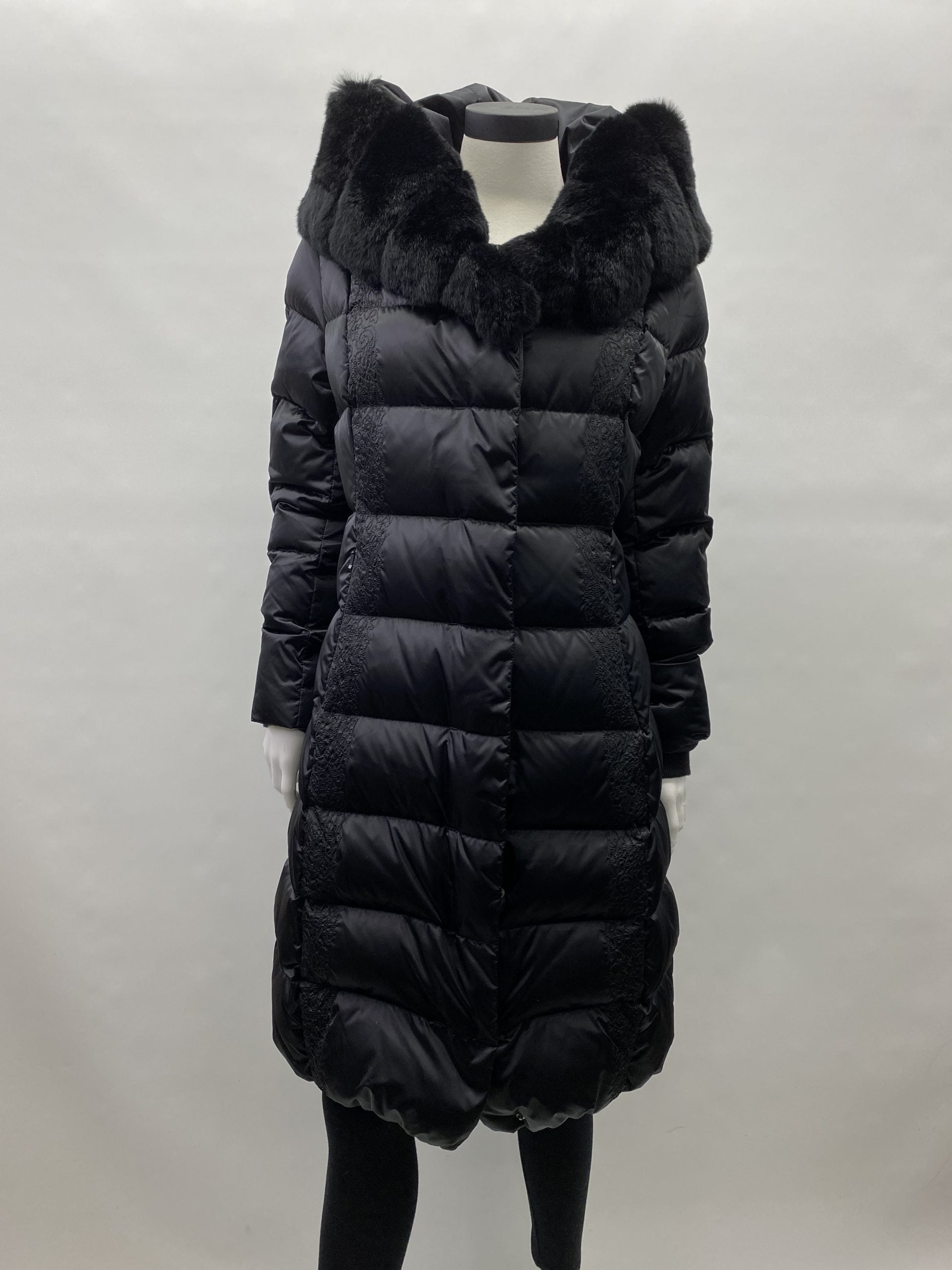 Manteau long de duvet garni d’un col princesse en lapin. Cet item est disponible en noir