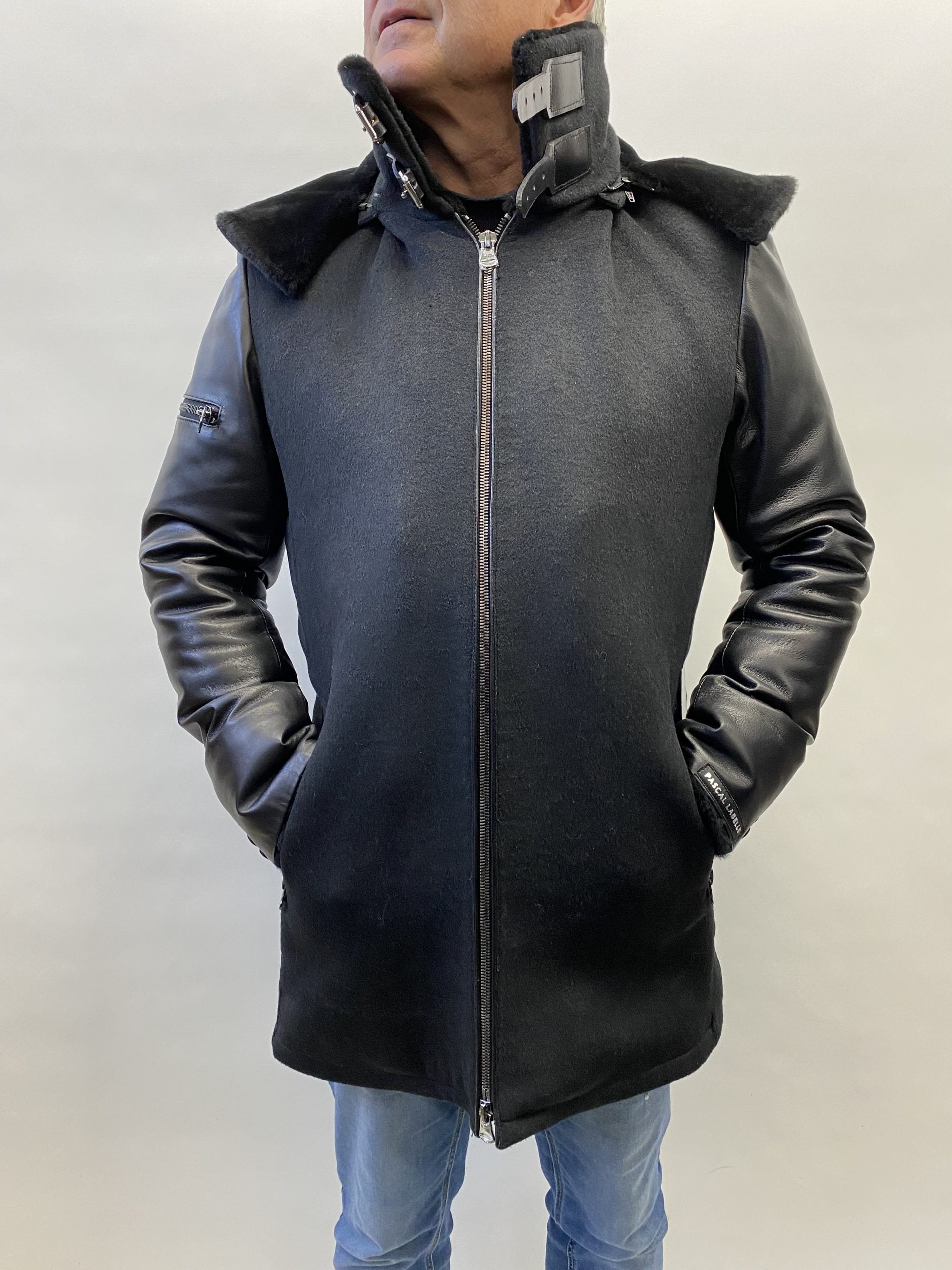 Pascal Labelle offre des pièces contemporaines de grande qualité qui conviennent à un mode de vie urbain, et ce, toujours avec le souci du détail. Il combine des matériaux bruts et différents styles, afin de fournir des créations uniques qui répondent aux besoins diversifiés de la clientèle. – Manteau de laine et cachemire, et détails de cuir. Il est muni d’un capuchon retourné en mouton. Cet item est disponible en noir